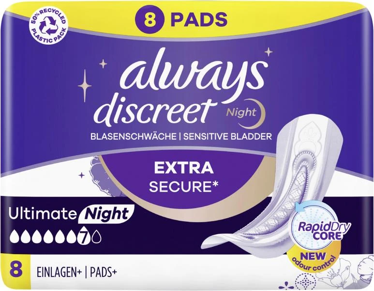 Ideal für stärkere Anforderungen. Always Discreet Inkontinenzeinlagen Plus Ultimate Night sind besonders sicher und kaum spürbar. Sie sind entwickelt, um Ihnen zusätzlichen Komfort und Schutz zu bieten, damit Sie sich keine Sorgen mehr machen müssen.Die einzigartige Struktur der Einlagen ermöglicht starken Schutz mit einem ultra dünnen Kern, sodass Sie keine Kompromisse zwischen Komfort und Schutz eingehen müssen. Wenn Niesen oder Lachen Blasenschwäche verursachen, bieten die Always Discreet Einlagen Plus Ultimate Night optimalen Schutz.