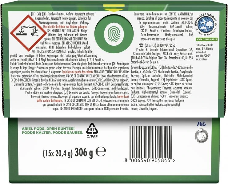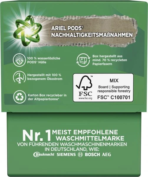 Ariel Pods Nachhaltigkeitsmaßnahmen: 100% wasserlösliche Pods-Hülle. Hergestellt mit 100% bezogenem Ökostrom. Ausgezeichnete Ergebnisse bei kälteren Waschtemperaturen. Box hergestellt aus mindestens 70% recycleten Papierfasern.