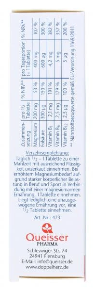 Die Tabletten von Doppelherz enthalten 400mg Magnesium in sinnvoller Kombination mit den Vitaminen B1, B6, B12 und Folsäure. Magnesium ist ein lebensnotwendiger Mineralstoff, den der Körper nicht selbst bilden kann. Eine Speicherung ist nur in begrenztem Umfang möglich. Magnesium leistet einen Beitrag zum normalen Energiestoffwechsel, zur normalen Funktion des Nervensystems und zur normalen Muskelfunktion. Vitamin B1 trägt zu einer normalen Herzfunktion bei. Folsäure ist ein wasserlösliches Vitamin der B-Gruppe. Es trägt zur normalen Blutbildung bei und heit eine Funktion bei der Zellteilung. Die Vitamine B6 und B12 spielen eine Rolle bei der normalen Bildung der roten Blutkörperchen, die für den Sauerstofftransport wichtig sind. Vitamin B6 leistet außerdem einen Beitrag zum normalen Eiweiß- und Glycogenstoffwechsel.