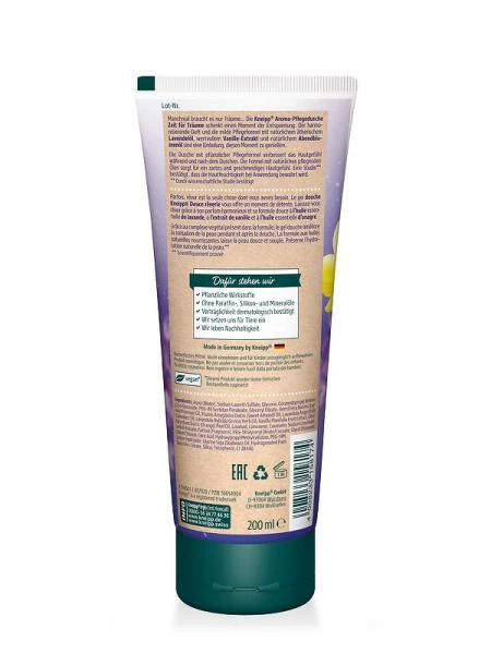 Manchmal braucht es nur Träume… Die Kneipp® Aroma-Pflegedusche Zeit für Träume schenkt einen Moment der Entspannung. Der harmonisierende Duft und die milde Pflegeformel mit natürlichem ätherischem Lavendelöl, wertvollem Vanille-Extrakt und natürlichem Abendblumenöl sind eine Einladung, diesen Moment zu genießen.Die Dusche mit pflanzlicher Pflegeformel verbessert das Hautgefühl während und nach dem Duschen. Die Formel mit natürlichen pflegenden Ölen sorgt für ein zartes und geschmeidiges Hautgefühl. Eine Studie** bestätigt, dass die Hautfeuchtigkeit bei Anwendung bewahrt wird.**Durch wissenschaftliche Studie bestätigt.Rezeptur ohne Mikroplastik. Vegan.