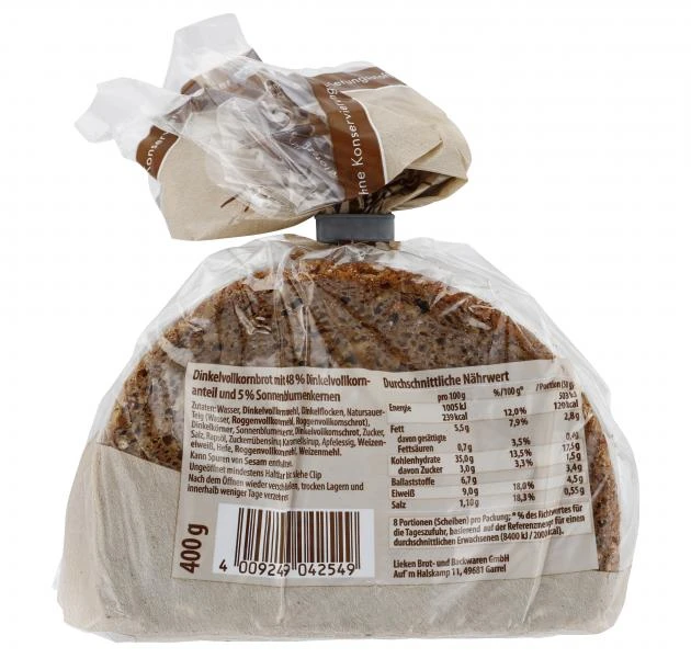 Dinkelvollkornbrot mit 48% Dinkelvollkornanteil und 5% Sonnenblumenkernen.