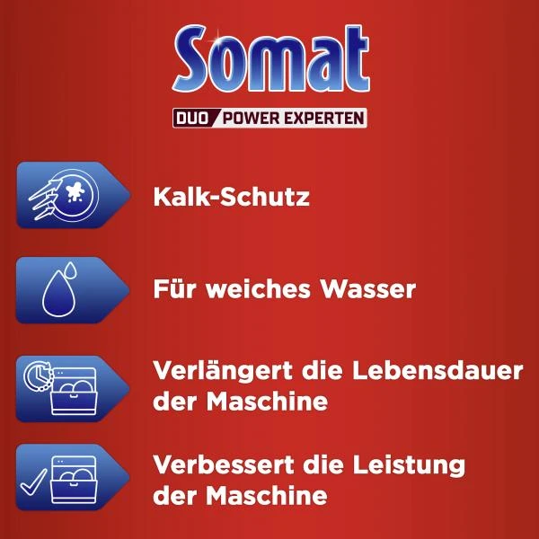 Das Somat Spezial-Salz für die Geschirrspülmaschine ist vollkommen rein und frei von unlöslichen Bestandteilen.Es ist besonders einfach zu dosieren aufgrund des grobkörnigen Salzes und der praktischen Öffnung.3x Anti-Kalk Aktiv (in Spülmaschine, Sprüharmen und in den Leitungen) verhindert Kalkablagerungen und stärkt die Leistung des Geschirrspülers. Für eine längere Lebensdauer Ihrer Spülmaschine.